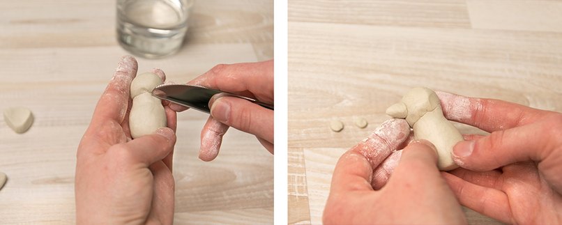 Nun verbinden wir alle vier Teile zu einem. Und formen aus einem kleinem Stück Modelliermasse den Schnabel und die Augen der Taube. Da wir insgesamt zwei Tauben benötigen, wiederholen wir die vorherigen Schritt, sodass wir anschließend zwei fertige Tauben haben.