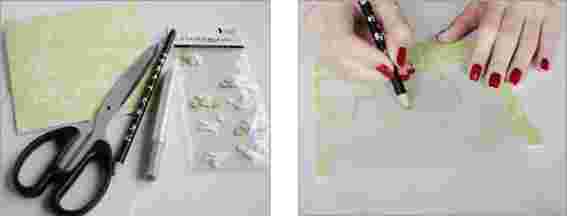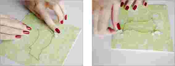 Schneiden Sie Ihre Schablone sorgfältig aus. Fahren Sie die Schablone an der gewünschten Stelle auf der Einladungskarte mit dem Glitzer-Stift nach.