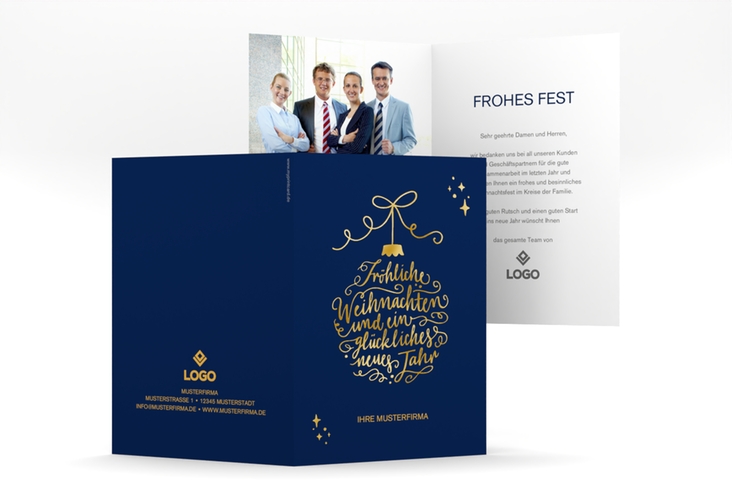 Business-Weihnachtskarte Lichterglanz A6 Klappkarte hoch blau gold für Firmen, mit Weihnachtskugel-Kalligrafie   Business-Weihnachtskarte Lichterglanz A6 Klappkarte hoch blau gold für Firmen, mit Weihnachtskugel-Kalligrafie