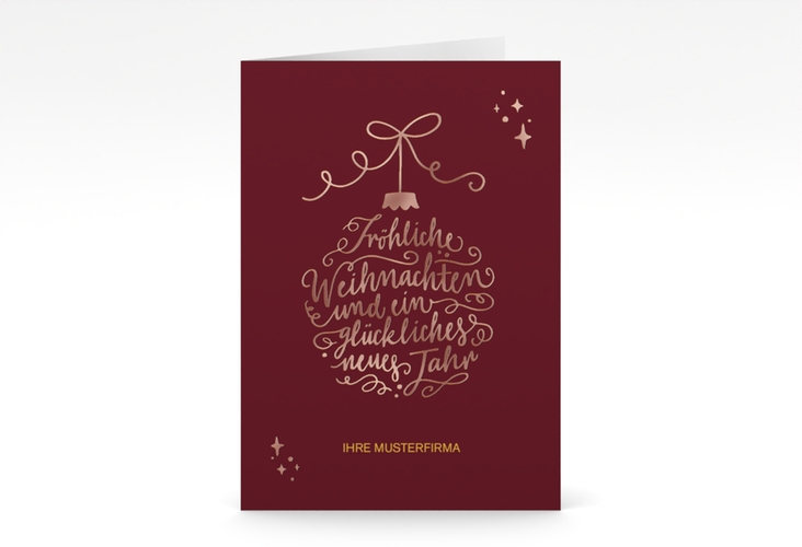 Business-Weihnachtskarte Lichterglanz A6 Klappkarte hoch rot rosegold für Firmen, mit Weihnachtskugel-Kalligrafie   Business-Weihnachtskarte Lichterglanz A6 Klappkarte hoch rot rosegold für Firmen, mit Weihnachtskugel-Kalligrafie